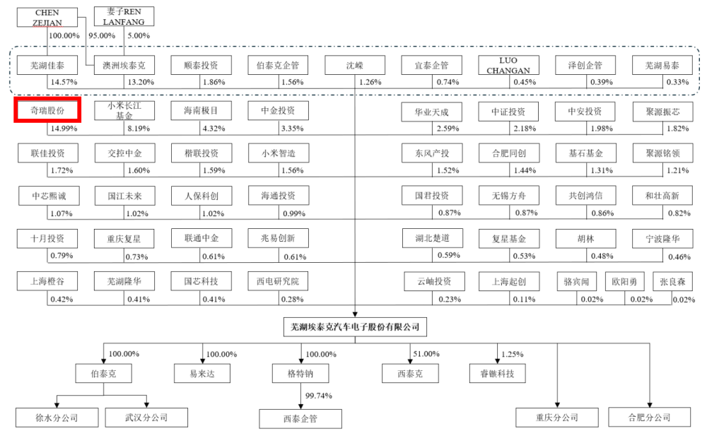 埃泰克称,公司研发费用率低于同业业平均值次要是因为公司收入规模低于同业业上市公司、公司取同业业公司正在客户布局、产物类别等方面存正在必然差别、有针对性地开展研发项目所致。招股仿单显示,2022年12月23日,埃泰克无限全体变动为股份无限公司。小米集团通过小米长江基金、海南极目、小米智制公司持有该公司1951。38万股,占比14。66%;复星基金持有358。89万股,占比2。7%,沉庆复星持有140。27万股,占比1。05%,合计占比3。75%;张良森、欧阳怯、骆宾闻别离持有11。11万股、7。31万股、6。31万股,别离占比0。08%、0。05%、此中,复星基金、沉庆复星受统一从体复星创富(沉庆)企业办理无限公司现实节制,欧阳怯、张良森、骆宾闻为沉庆复星之施行事务合股人复星创富(沉庆)企业办理无限公司的员工。2023年9月22日,埃泰克通过刊行股份及领取现金体例收购易来达少数股东持有的股份完成取易来达的沉组。埃泰克本次增资价钱为37。57元/股,共计增发124。71万股,用以领取部门买卖对价;2024年1月16日,瑞创投资(奇瑞汽车)对外让渡其持有的10。90%埃泰克股份,沈嵘对外让渡其持有的0。40%埃泰克股份,让渡价钱为37。57元/股。不外,2024年12月12日,埃泰克、小米长江基金、复星基金、沉庆复星等投资者取聚源铭领、聚源振芯签订《股份让渡和谈》,商定聚源铭领、聚源振芯以24。57元/股的价钱受让小米长江基金、济南复星、沉庆复星等投资者所持有的部门刊行人股份。对此,埃泰克正在招股书中申明,聚源铭领、聚源振芯看好公司成长前景,同时小米长江基金、复星基金等股东基于本身资金放置提出减持需求,聚源铭领、聚源振芯受让上述股东所持有的部门股份。对于此次的入股价钱的订价根据,埃泰克称本次股份让渡协商期间,一级市场流动性收缩,让渡方分析考虑项目内部收益率、预期IPO退出周期等要素,经取受让方敌对协商后,确定本次股权让渡价钱。同时,此次减持,小米长江基金套现约1500万元,复星套现8086。23万元。张良森、欧阳怯、骆宾闻等复星员工别离套现218。18万元、122。11万元、73。71万元。值得留意的是,2024岁尾小米等投资者让渡的股价比拟前两次37。57元/股的让渡价钱下降34。6%。埃泰克前身为埃泰克无限,系由埃泰克、奇瑞科技配合出资设立。埃泰克无限设立时的股权布局奇瑞科技出资占比为49%。据天眼查显示,奇瑞科技是奇瑞汽车的全资子公司。能够说埃泰克从设立之初就有奇瑞汽车的影子。招股仿单显示,奇瑞股份持股14。99%,是外部投资者中的最大出资者。同时,2022-2024年,对奇瑞汽车联系关系发卖收入的金额别离为6亿元、10。62亿元和18。68亿元,别离占比27。6%、35。32%、53。89%。埃泰克对此注释次要是因为联系关系方奇瑞汽车整车销量持续提拔,带动公司对其发卖金额快速增加。