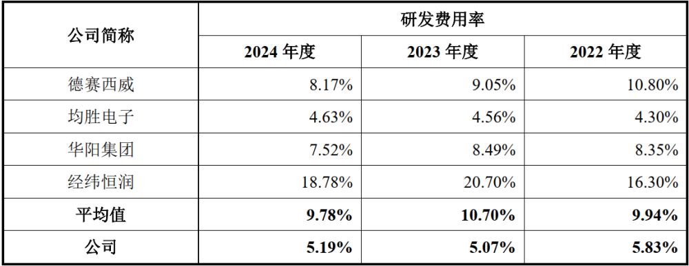 招股仿单对此注释称,车身域电子产物取经纬恒润电子产物营业毛利率存正在必然差别的缘由正在于其取纬恒润电子产物营业笼盖范畴分歧、次要客户分歧导致量产规模、用料成本和产物订价存正在差别、受芯片价钱影响以及低毛利率产物占比影响;智能座舱域电子产物毛利率低于可比公司是因为规模采购小所导致的产物单元成本提高、公司采纳“以价换量”的合作策略以及芯片原材料价钱的上涨等要素。值得关心的是,埃泰克的研发费用率大幅低于同业可比公司。2022-2024年度,埃泰克研发费用率取同业可比平均值比拟,差值别离为-4。11%、-5。63%、-4。59%(如下图所示)。
